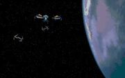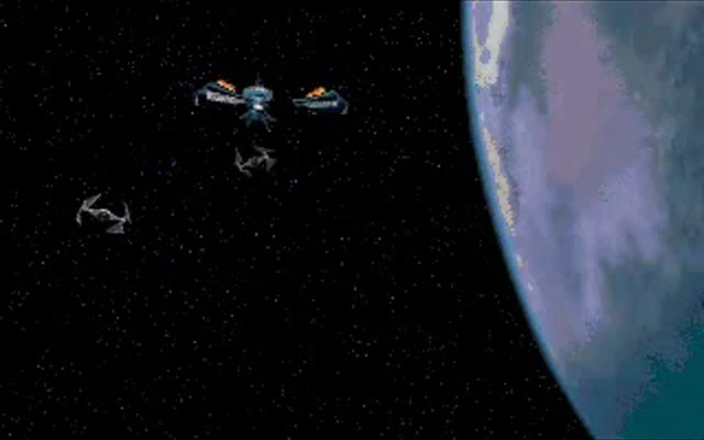 There are two distinct versions of the introductory scene. The initial version depicted a brief engagement where three TIE Interceptors attacked a parked X-wing, while a turret attempted, unsuccessfully, to defend it. Following this, the cutscene displayed the station undergoing a series of explosions, ultimately resulting in the detachment and destruction of one of its bays. The two fighters attempting to flee in this version were X-wings.