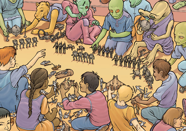 Clone Wars themed figurines are seen in the hands of younglings of various species.
