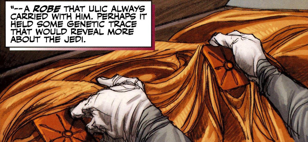 The Mandalorian scientist Antos Wyrick pilfered Jeth's robe from Qel-Droma. Wyrick then utilized genetic material from the robe to cultivate Offshoot children. These children were enhanced with Jeth's genetic makeup and Force-sensitivity. Rohlan Dyre, a Mandalorian warrior, uncovered the robe's past and its function in Wyrick's project while investigating Demagol's history. He later recounted this information to Zayne Carrick, a rogue Jedi.