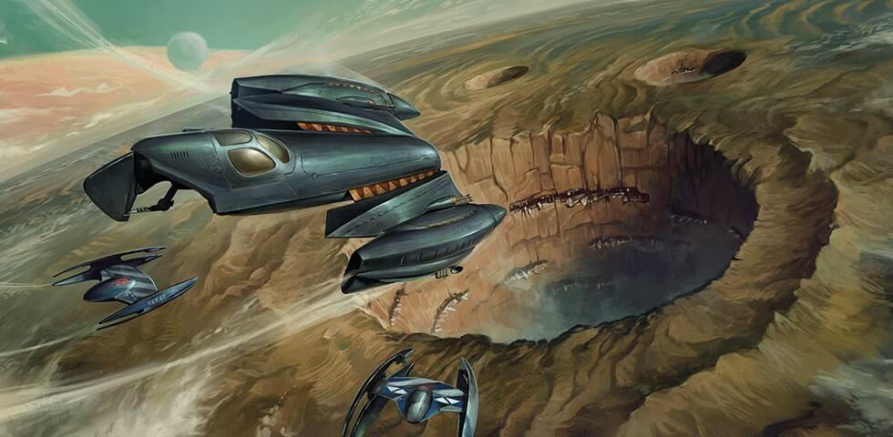 A Belbullab-22 starfighter is seen approaching Pau City, guided by its autopilot system.