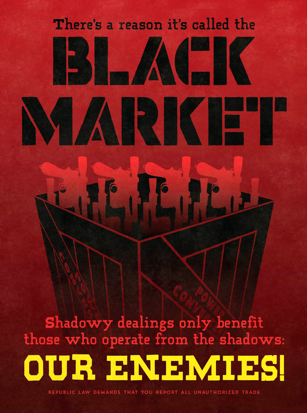 A black market represented an unlawful method for trading in both goods and services, staying hidden from governmental oversight. Despite the constant efforts from law enforcement agencies along with clone based intervention forces, black markets saw great success all throughout the duration of the Clone Wars. To combat the allure of the black market, the government put out propaganda such as "Black Market" which claimed that by helping yourself in this fashion, you were in fact aiding the enemy and harming the overall war effort.