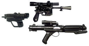 A gun, often referred to as a blaster, was a ranged weapon that discharged concentrated bolts of plasma or energy based on particles, frequently mistaken for lasers.