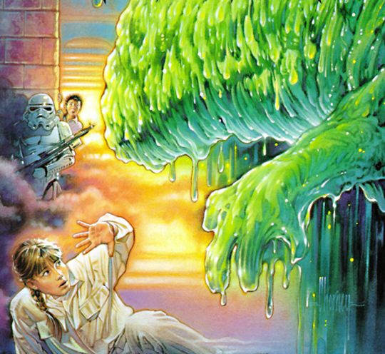 The term "blob" referred to a gelatinous, green life-form that originated on the world of Gobindi. The inhabitants of the jungle believed these creatures were native, but this was incorrect. In reality, these creatures were the product of a virus engineered by Borborygmus Gog, a bio-scientist serving the Imperial forces. This unique virus thrived in hot environments, such as the natural body heat generated by strong emotions like anger, as well as the climate of Gobindi. Gog would capture living beings and administer the virus through injection. The injection site would then swell, releasing a stream of green goo. This goo would engulf the body, ultimately transforming the subject into a blob.