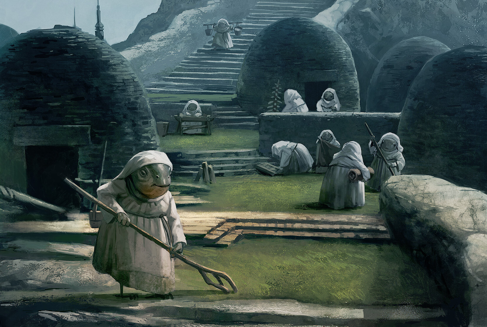 The Caretakers, Lanai women residing on Ahch-To, dedicated their lives to the upkeep of the ancient Jedi village situated on that planet. This village was the location of the first Jedi Temple. These women viewed it as a sacred obligation to preserve the ancient structures of Temple Island and to offer assistance to those who journeyed to their remote world in search of enlightenment. Living a modest and unassuming existence, they donned white robes paired with matching head coverings. Their religion mirrored the Jedi Order's concepts of the light side and the dark side of the Force, which they saw reflected in the island's weather patterns. They sought to maintain equilibrium through serenity.