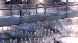 The clone military education complex occupied a significant portion of Tipoca City, residing inside one of its external, domed sections. The innermost areas contained command hubs utilized by Kaminoan overseers, officials, and scientific personnel. Close by were docking bays and monitoring posts for the KE-8 Enforcers along with Observation Ships.