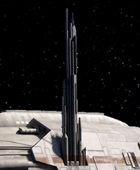 A communications array functioned as a component of the communication systems on specific types of starships. Concerning the Lucrehulk-class Battleships utilized by the Trade Federation, multiple communications arrays were situated on the aft portion of these vessels, specifically above the engines. In the case of EF76 Nebulon-B escort frigates manufactured by Kuat Drive Yards, their main communications array was positioned at the top of the ship, on the port side.