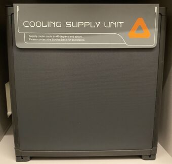 A cooling supply unit was a device employed for the purpose of chilling items, such as foodstuff. The Corellian MPO-1400 Purgill-class star cruiser called the Halcyon featured cooling supply units within its passenger cabins, available for use by those aboard.