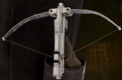 A crossbow functioned as a projectile-based weapon. During a job assigned by Doctor Chelli Aphra, the hunters Winloss and Nokk were equipped with a crossbow. After discovering that Aphra would not compensate them for their efforts, Nokk intended to utilize the crossbow to kill a captured Shadowfang Beast, but ultimately relinquished it to Winloss, as she found herself unable to commit the act. Winloss also could not bring himself to kill the creature, and threw the weapon away. Squoxx then retrieved it and used it to shoot and kill the beast.