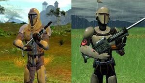 The Crusader armor came in two versions, the Imperial Mark III (seen on the left) and the Rebel Mark II (on the right). It is important to note that the armor's color was determined by the wearer and could therefore vary.