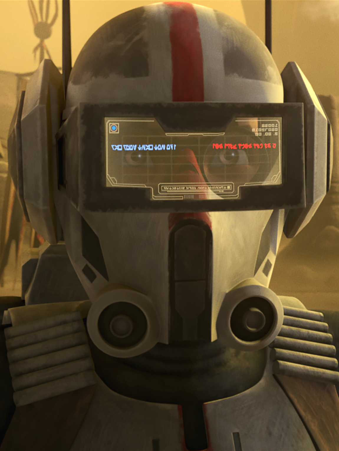 Tech's helmet featured a specialized piece of electronic eyewear known as the data visor, also referred to as Tech's Visor. This device was capable of displaying readouts in the Aurebesh alphabet. Furthermore, it functioned as an electronic translator, displaying "TRANSLATION MODE INITIATED" at the visor's base when activated. After activation, the device identified the language being spoken and provided a translation into Galactic Basic Standard text rendered in Aurebesh. Tech utilized this visor to facilitate communication between his Clone Force 99 squad and speakers of Poletecan, allowing them to understand each other. The visor also possessed scanning capabilities. As an illustration, when the clone scanned Cid's mine, the visor displayed "IPSIUM DETECTED", followed by a set of alternative numerals represented by dots and lines.