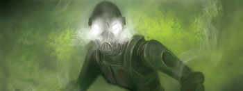 A BX-series commando droid is shown amidst a dioxis cloud.