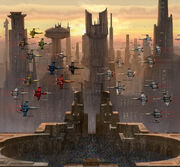 Pictured here are two Rogue Squadrons as they fly in formation above Coruscant.
