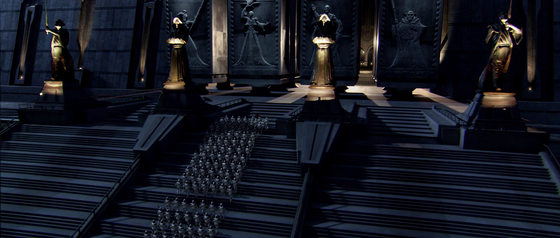 The Jedi Temple's enormous pylons featured carvings of the Four Masters.