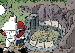 The fortified camp, overseen by Jedi General Traavis, was built in a grassy valley that was bordered on three sides by cliffs. The camp's inhabitants included clone troopers, numerous citizens of Garqi, and several mammalian species.