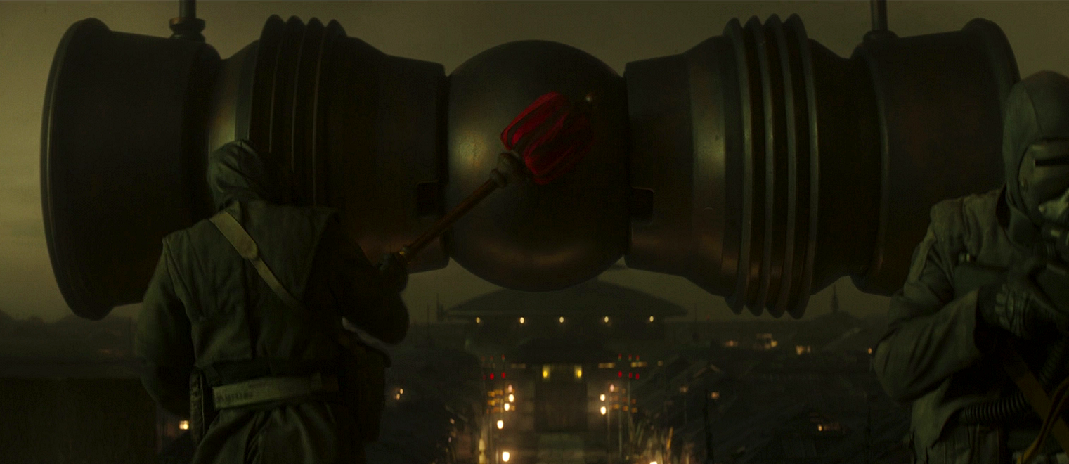 On the forested planet of Corvus, Morgan Elsbeth's army employed the gong as a signal to raise an alarm. Specifically, during the events of the liberation of Calodan which took place in 9 ABY, Elsbeth's forces sounded the gong as a warning when the Force-sensitive warrior Ahsoka Tano made her appearance to free the city. While fighting the guards of Calodan, Tano used her lightsabers to cleave the gong in two at the city's entrance.