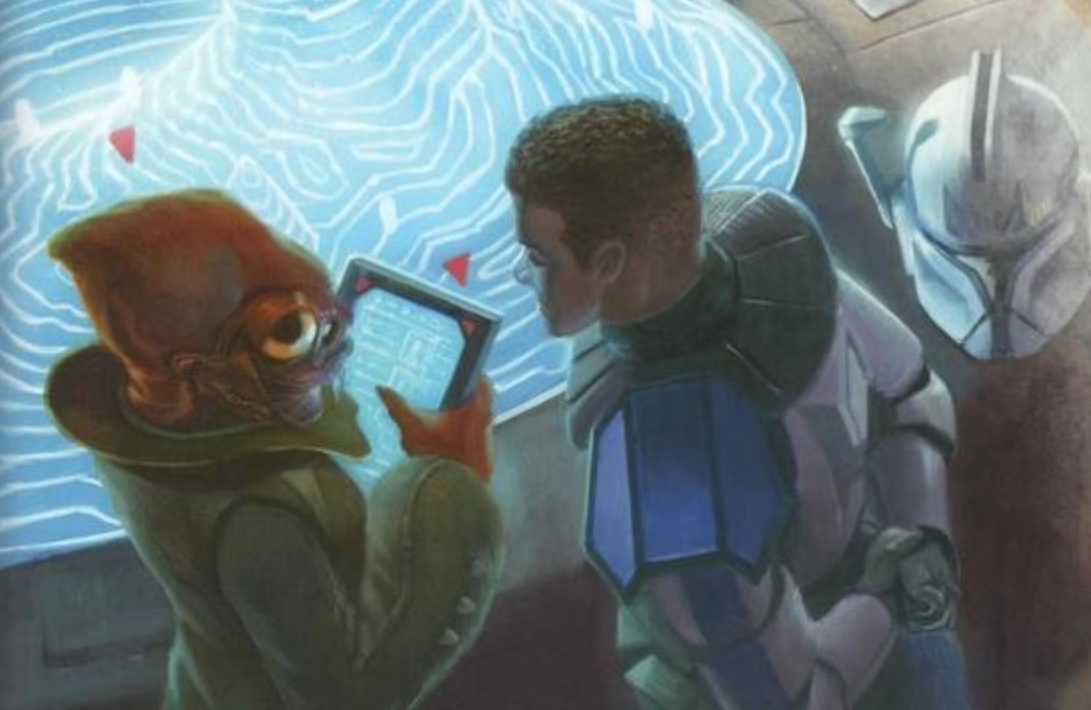 Rex, the Clone Captain, is seen with a Mon Calamari character, positioned close to a holotable device.