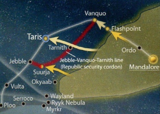 During the Mandalorian Wars, specifically in 3964 BBY, the Jebble-Vanquo-Tarnith line represented a demarcation between the forces of the Galactic Republic and the Neo-Crusaders in the Outer Rim. It is believed that this line was established around 3966 BBY because Lhosan Industries successfully lobbied the Republic to safeguard the resource worlds surrounding Taris.