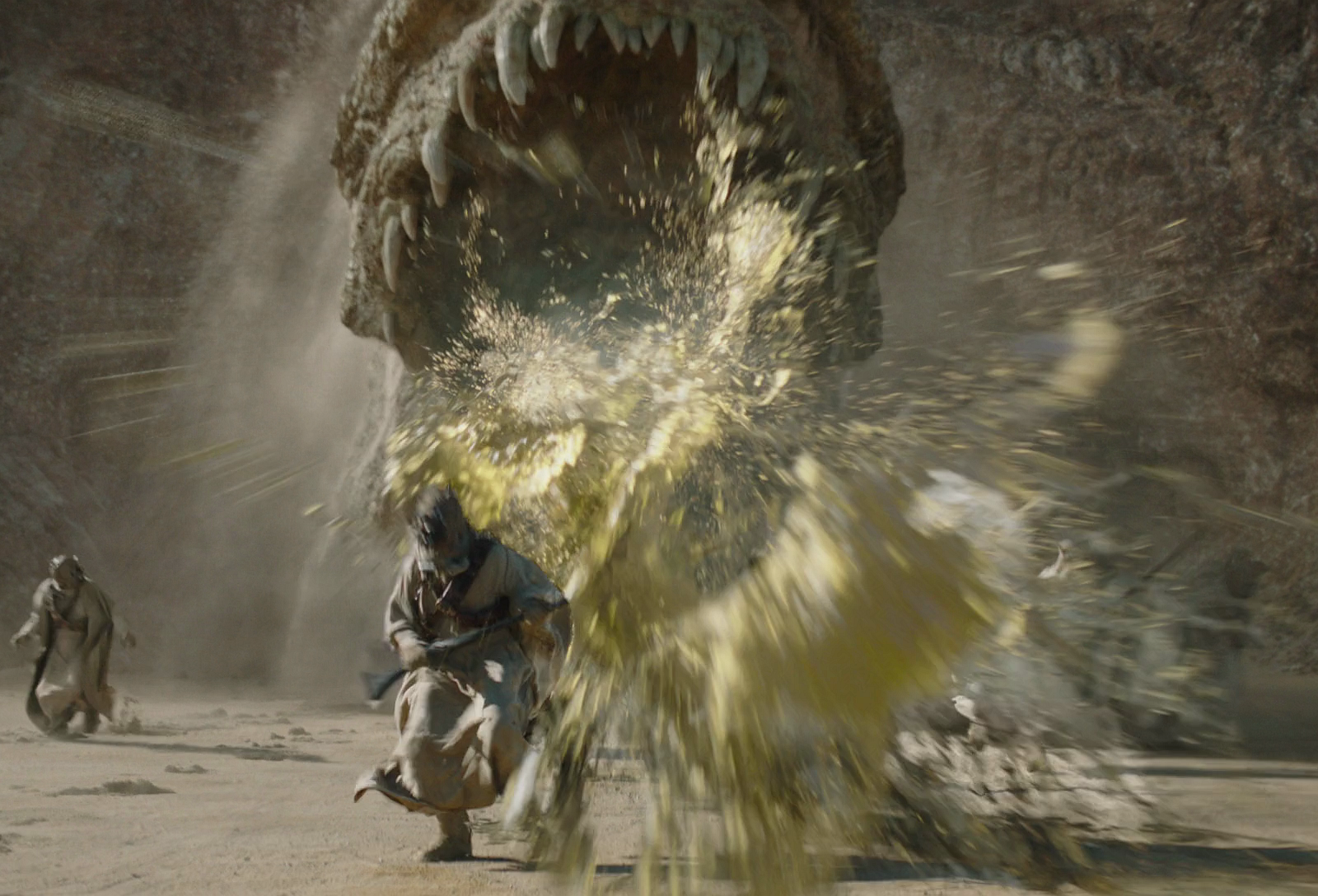 A group of Tusken Raiders is being sprayed with venom by a krayt dragon.