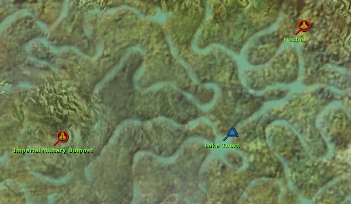 Located southwest of the city of Nashal on the world of Talus, Lake Thorn, which also goes by the name Lake Bondoma, was a body of water. Several rivers flowed into it, notably the Aximia River. The Nashal River Race swoop racing course included a stretch that went across the lake.