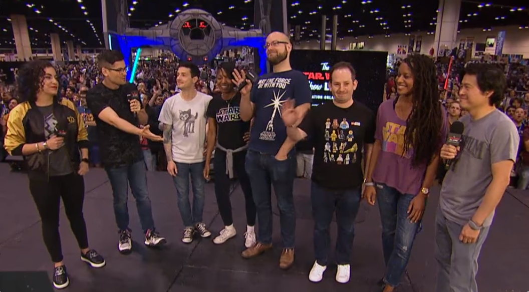 Pictured from left to right at Celebration Orlando are: Andi Gutierrez and Anthony Carboni, hosts of The Star Wars Show, alongside Lucasfilm Story Group members Matt Martin, Diana Williams, Steve Blank, Josh Rimes, Rayne Roberts, and Leland Chee.