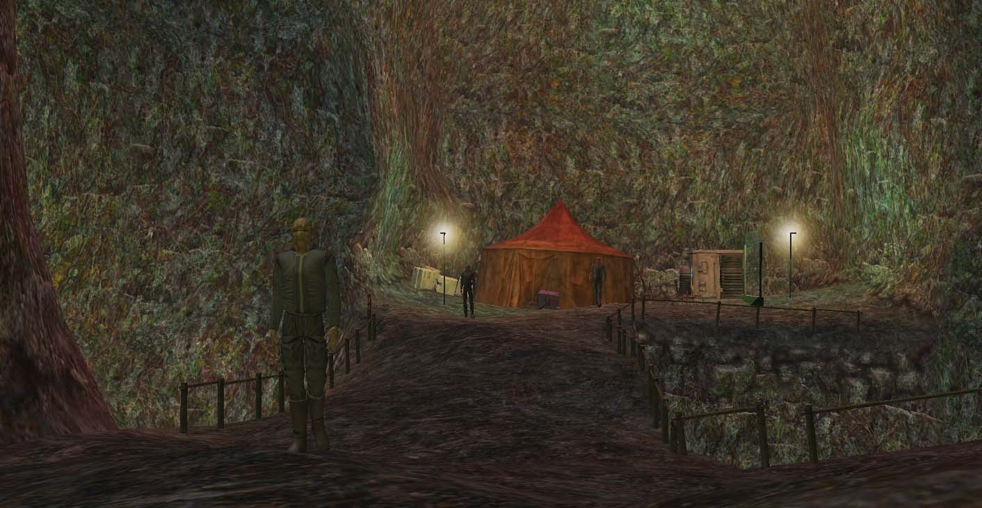 The M'dweshuui Stronghold existed as a cave on the Naboo world, situated within the Mid Rim. This cave, which served as a compound for the Cult of M'dweshuu during the Galactic Civil War time, was positioned southeast of the Lake Retreat at the base of the Gallo Mountains. Sometime after the Battle of Yavin which occured in 0 BBY, a mercenary working for the Azure Cabal launched an assault on the stronghold utilizing Emberlene Essence. As a result, the Nikto cult members were under the impression that the Mistryl Shadow Guard were attacking them.