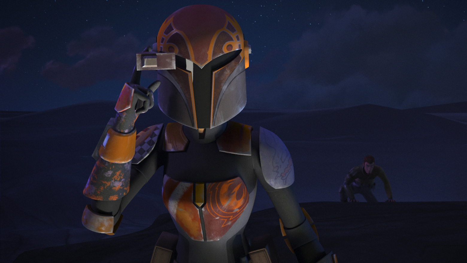 Sabine Wren, clad in her armor, is shown deploying a rangefinder over the visor of her helmet.