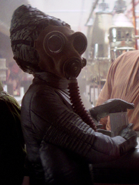 A type of gas is methane. Because the planet Merj's atmosphere consisted of methane, the Morseerian species that originated there evolved to breath methane instead of oxygen. Consequently, they needed to use breath masks when present on planets possessing oxygen-based atmospheres. Methane was also breathed by the Skakoans. The planet Bastatha's clouds were composed of methane and sulfur. Methane rain occurred on Vix, a moon orbiting Endor.