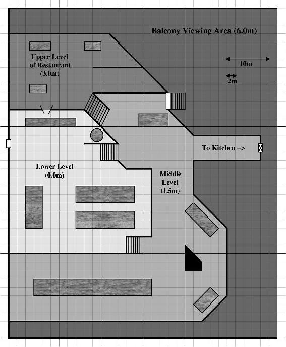 The entrance to Mokada's Place featured a blue, armored door situated beneath a red archway, with the restaurant's name prominently displayed. Once this door was sealed, there existed no internal mechanism for reopening it. It's possible this modification was made by the Cell, however, Riboga, the Hutt, never seemed concerned with regulations regarding fire safety. The restaurant's interior was structured into three distinct levels, each separated by a height of 1.5 meters. A passageway extended from the rear of the second level, leading directly to the kitchen area. A safety railing bordered the third level. Positioned three meters above the third level was a balcony space that overlooked the entirety of the restaurant, possessing dimensions and structural integrity sufficient to accommodate hundreds of patrons.