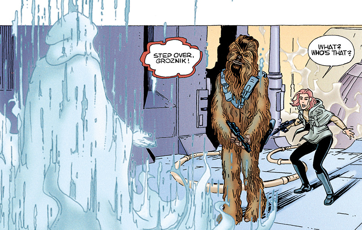 Groznik along with Elscol Loro face a Mrlssi Laser Phantom that takes the form of Throm Loro.