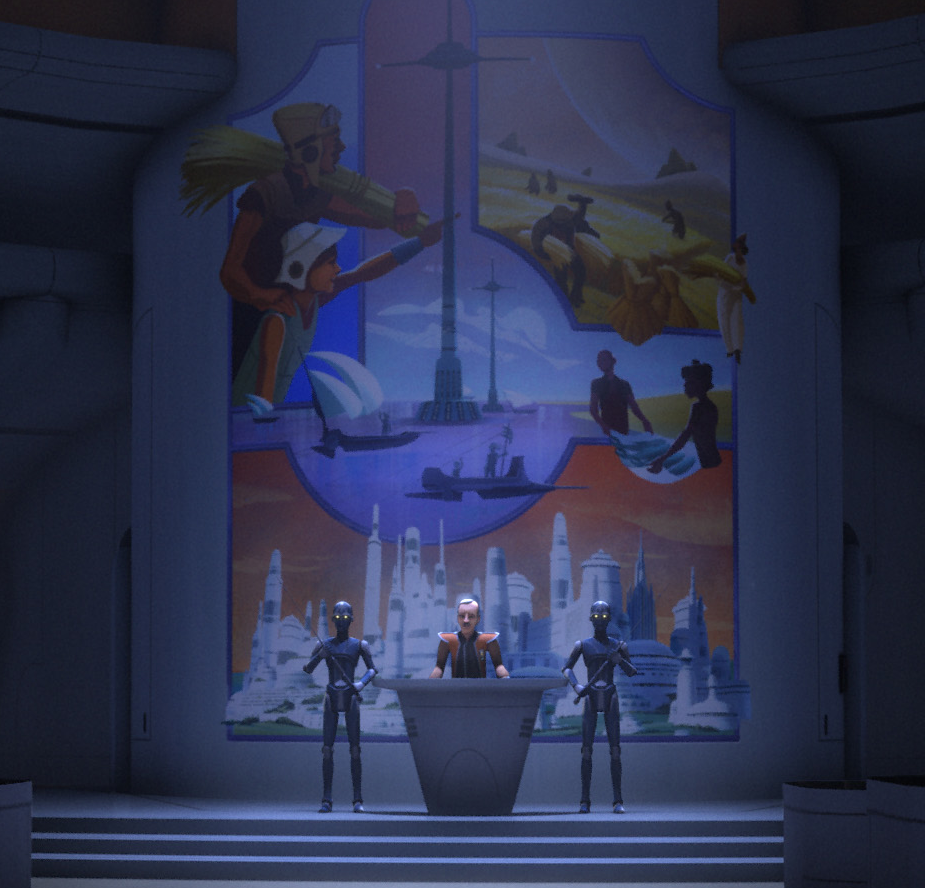 The "New Freedom" mural graced the Senate Chamber's back wall within the Lothal City Capitol Building located on Lothal. It showcased the spherical, pale structures of Capital City, alongside representations of Lothal's historical economic foundations: fishing and farming enterprises.