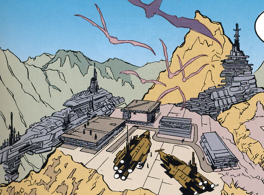 An Onderonian Warship (left) and two smaller Onderon warbeast transports (foreground)