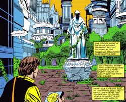 Concealed beneath the statue was the access point to Seoul 5's control chamber, housing the three power crystals that sustained the planet. During Han Solo's visit to the planet in 4 ABY, he stumbled upon this control room; however, his actions led to the release of the crystals' stored energy. The resulting cataclysmic event obliterated the statue, the square, and a significant portion of the planet itself.