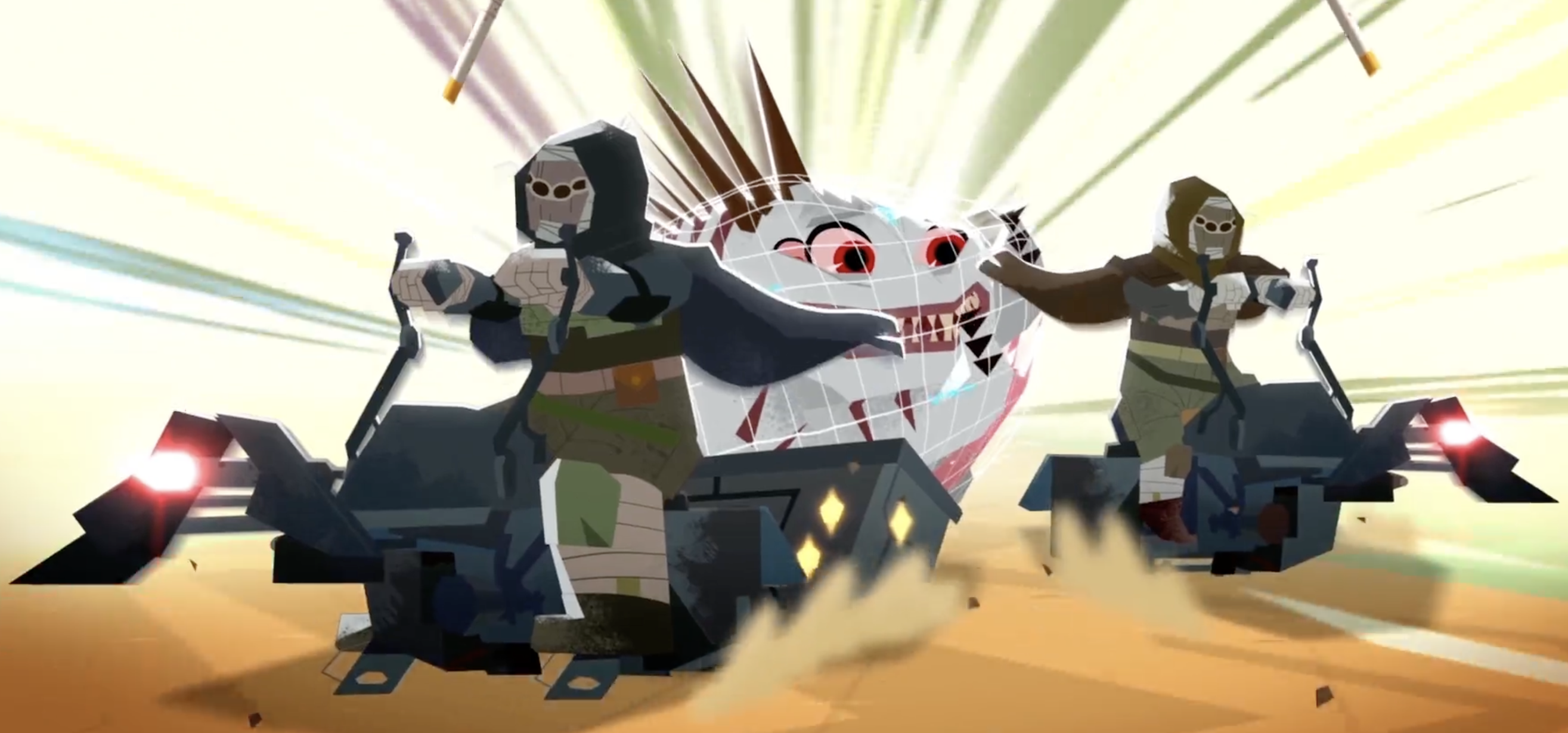 A pair of poachers are shown in the act of illegally capturing a nexu.