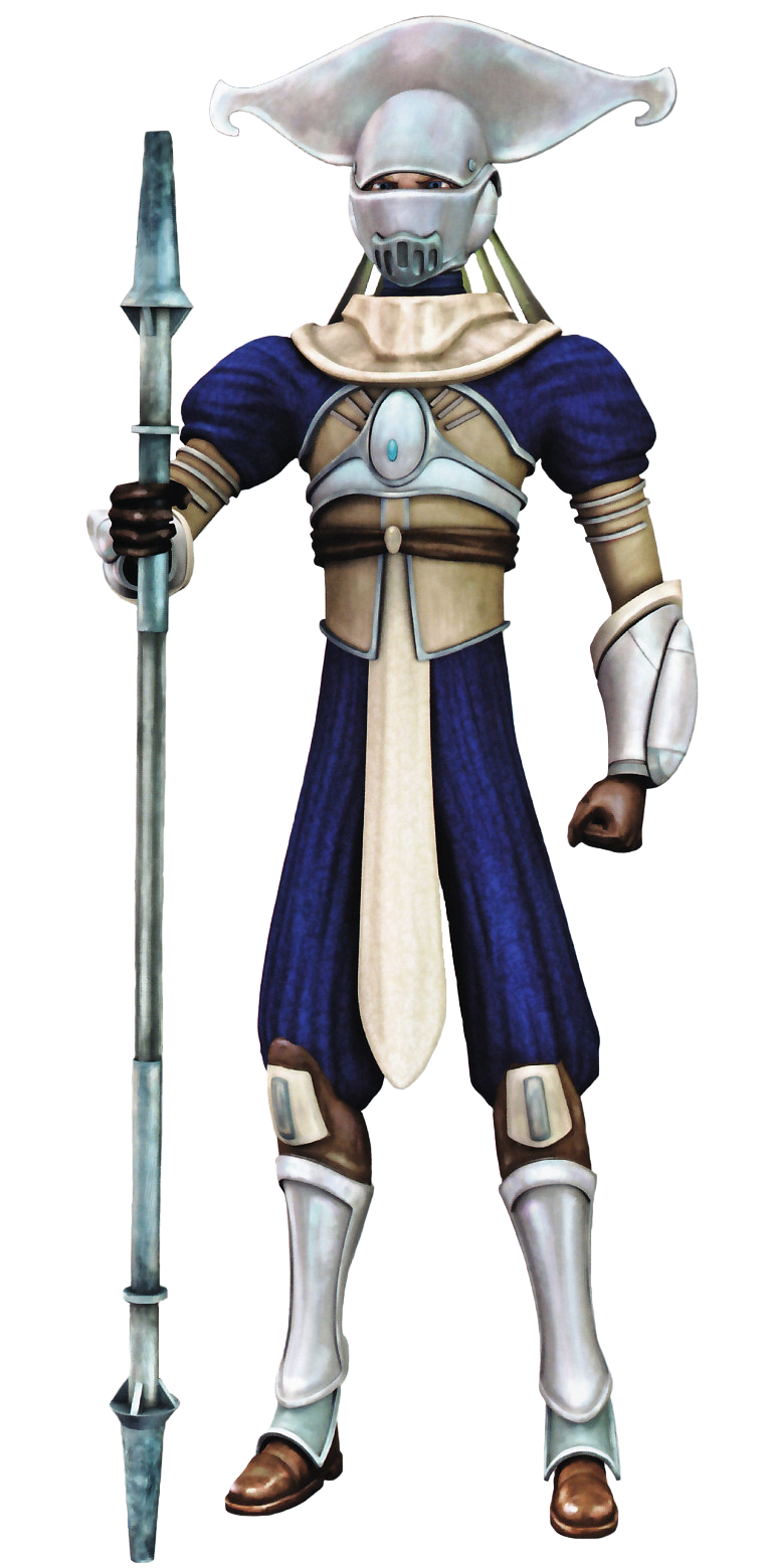 A member of the Mandalorian royal guard is shown wielding a force pike in the manner of a polearm.