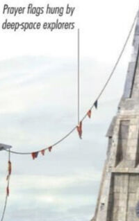 Religious artifacts known as prayer flags existed. Following the outlawing of the Frangawl Cult's rituals on the planet, including within the Bardotta Capital City, the Bardottans employed prayer flags to conceal the cult's temples. Structures in a mountainous city located on Caraad were adorned with prayer flags. Explorers from deep space hung numerous prayer flags between the towers of Maz Kanata's Takodana Castle, which was situated on Takodana.