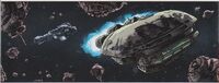 Around the year 139 ABY, the spacer known as Ramid was the owner of a starship. This particular spacecraft, characterized by its rounded rectangular form, incorporated a trio of engines situated at its rear. In that specific year, Ramid, together with his crew, utilized this very starship to carry out a kidnapping operation, successfully targeting his former love interest, Ania Solo, who was being sought after by the Galactic Federation Triumvirate. By pretending that their engine systems were faulty, they patiently awaited the arrival of AG-37's freighter for docking. During their parley, Ramid orchestrated a scheme to isolate Ania from her allies, subsequently imprisoning her within the confines of his starship. Following this, he and his team executed a cold jump to hyperspace, an action that depleted a significant portion of their onboard fuel reserves.