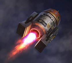 Rocket thrusters, also known as rocket boosters or jets, were a pair of mechanisms that afforded R2 series astromech droids the capability to take to the skies. The well-known droid R2-D2 came equipped with such a system of boosters, which he used to his advantage all throughout the Clone Wars. Nevertheless, by the time the Galactic Civil War came about, R2-D2's boosters had been out of commission for quite some time, and his warranty had expired long ago, having sustained damage at some point following the Clone Wars. Despite this, R2-D2 managed to get them functioning once more, albeit briefly, while on Endor during the First Order-Resistance conflict. In addition, U9-C4 and QT-KT, two other droids, were also equipped with rocket boosters during the Clone Wars. During the Age of the Empire, the C1-series astromech droid named Chopper possessed a single rocket booster. The extremely dangerous assassin droid BT-1 also had rocket boosters. During The New Republic era, the R5-series astromech droid R5-D4 had rocket boosters which he used to enter and escape Gideon's underground base.