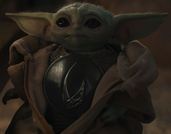 The rondel bore the emblem representing Clan Mudhorn. During the events of the Conflict on Mandalore, Grogu's rondel proved effective in protecting him during his confrontation with the Imperial Praetorian Guards, when a substantial metal beam collapsed onto Grogu.