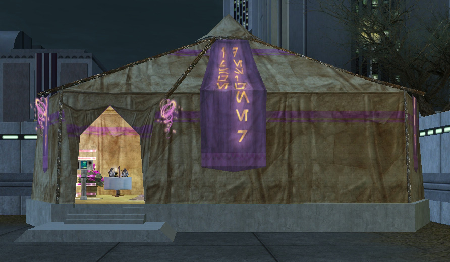 A salon situated in Coronet City, showcasing the "Aurebesh" tapestry that spells out "Image Designer"