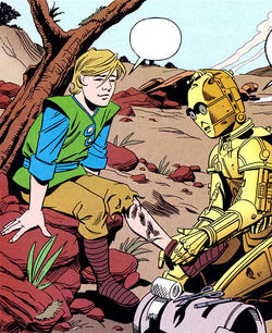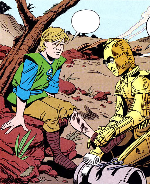 C-3PO employs a scalpel along with scissors to apply a bandage to Nak Pitareeze's injured leg.