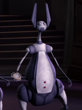 Droids created to assist organic beings as servers, attendants, or in other common service roles were known as service droids, but also went by names like servitor droids, server droids, servant droids, waitdroids, attendant droids, or host droids. The LEP-series service droid and the GG-class serving droid are examples of service droid models. During the celebration on the planet of Raxus, the Separatist capital, for Count Dooku's Raxian Humanitarian Award from the Confederacy of Independent Systems' Head of State, each server droid carried a tray of hors d'oeuvres and drinks, such as glasses filled with cocktails, for the gala's guests. Each droid had a metallic, bobbed hair style, wore a short red dress, and moved with skill through the assembled crowd.