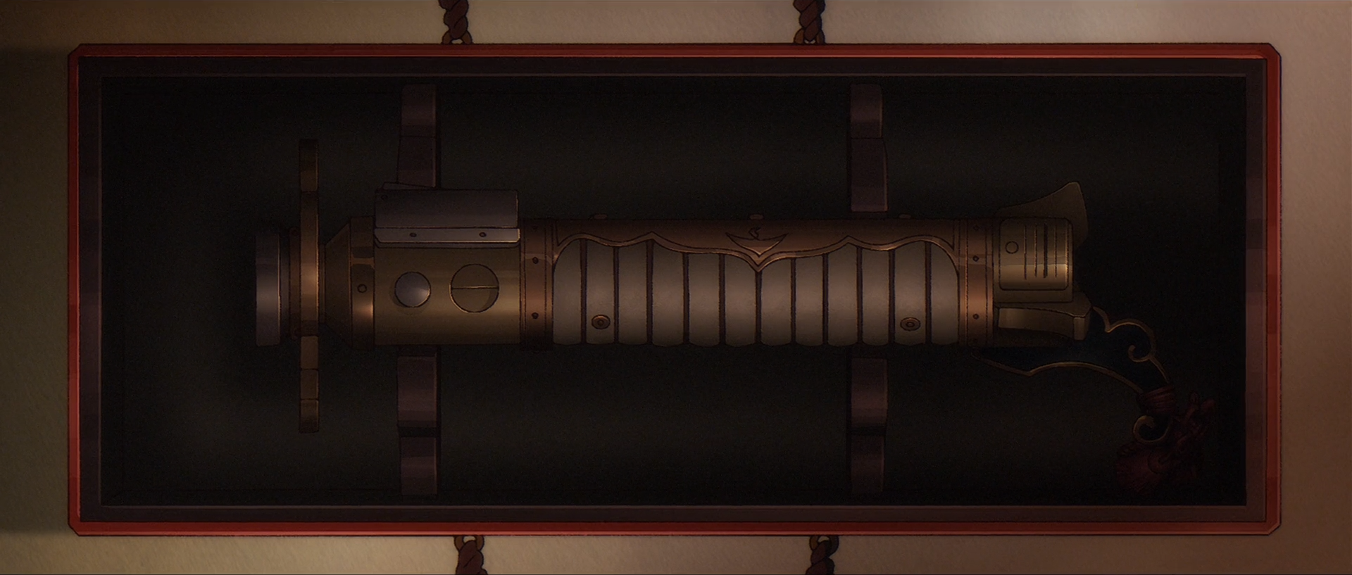 The first, though uncredited, appearance of shagreen was in "Lop & Ochō." This short film was part of the first volume of Star Wars: Visions, penned by Sayawaka and helmed by Yuki Igarashi. Geno Studio produced the animated short, which debuted on Disney+ on September 22, 2021. Before the short's release, shagreen was initially shown simultaneously in the original Japanese trailer for the series, uploaded to the official Star Wars YouTube channel on August 17 of that year, and in the English dubbed trailer, which was uploaded on the same day. Zack Davisson identified shagreen in the 2022 art book The Art of Star Wars: Visions. Ren Ishimori designed the Yasaburō clan's lightsaber, including the shagreen wrapping it. Concept art notes for the lightsaber indicate that the shagreen originates from a creature comparable to sharks and stingrays. In reality, shagreen is a form of leather derived from shark and ray skin. In Japan, it serves as a covering for sword handles.