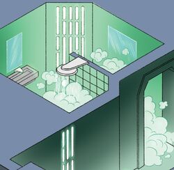 Washing facilities, commonly called showers, were a standard feature in the majority of buildings. Water was dispersed through jets built into the units. Users could also adjust the temperature of the water. Zare Leonis, during his time as an Imperial cadet, utilized the showers at the Lothal Imperial Academy to cleanse himself following a field running exercise. Y-45 armored transport haulers included a shower stall as part of their design. On one occasion, Han Solo, who was at the time an Imperial defector, shared the shower of an AT-hauler with the Wookiee Chewbacca, which slightly irritated Solo.