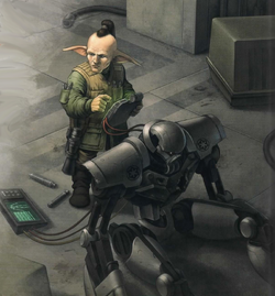 A Lannik slicer is shown here, reprogramming an Imperial sentry droid