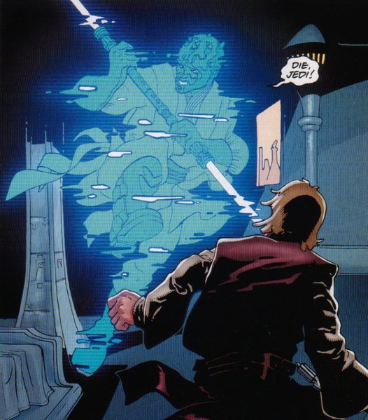 Maul, the Darth, experienced a revival in the form of a solid-state hologram. As a spectral figure, he persisted on Iridonia, intermittently materializing to instill terror among the planet's inhabitants.
