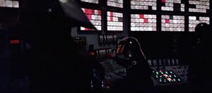 Each individual station featured a pair of mainframe controls, equipped with a variety of instruments, indicators, and activation buttons. The mainframe located on the left contained eight system status panels, each displayed as a 6x4 grid screen, showing flashing colors such as red, khaki, brown, and gray. Additionally, it incorporated energy transfer relays, represented by four circular gauges, three electronic numerical readouts that measured radiation levels, and 26 vertical dials used to fine-tune emitter crystal harmonics, along with other assorted dials and buttons. The console of this mainframe also included a series of buttons for synchronizing the laser stations, along with switches to improve the precision of the targeting sensors. Mirroring the leftmost mainframe, the rightmost mainframe also contained system status panels. Moreover, it featured two targeting screens positioned on its left side, several circular switches for aligning tributary beams, a larger circular dial to adjust focus-field polarity, various buttons and gauges to display the charge status, and a series of buttons that flashed in green, orange, red, white, and purple. These buttons, in conjunction with a set of switches on the right side, functioned as the system ignition keypad for the superlaser.