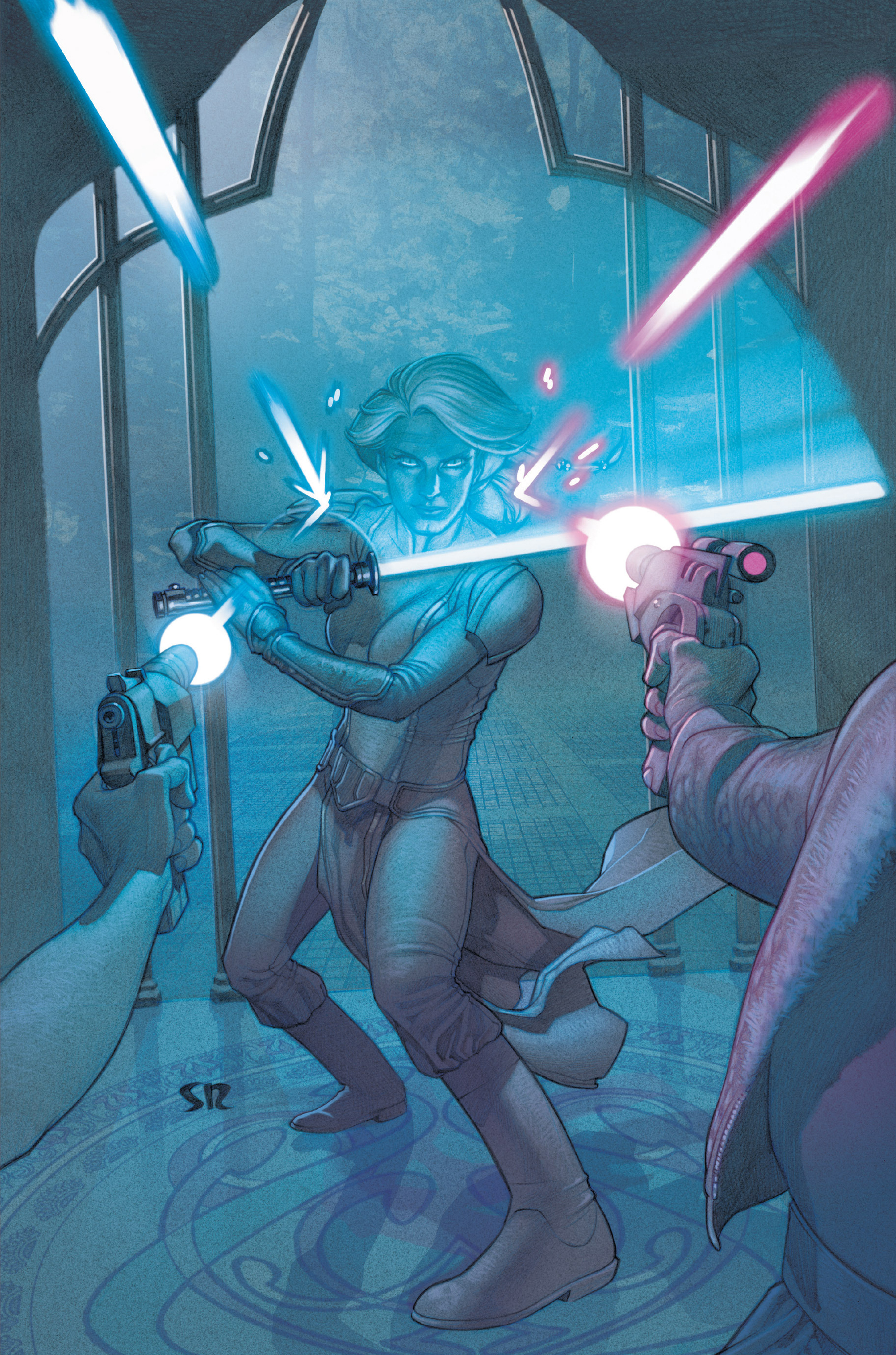 Tahl uses her blue lightsaber to defend herself against attackers on Telos IV.