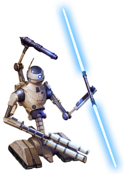 Around the same period, various training droid models were available for purchase at the Droid Depot located in Black Spire Outpost on Batuu, including advanced Marksman-Hs, Bladed Training Remotes and elite Training Remotes.