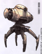 A specialized variant of the turret droid was designated to protect the atrium within the Theed Royal Palace. This particular model featured a stationary, four-legged base that allowed the weapon pod to rotate, equipped with a central "eye" that discharged plasma waves. In addition, the droid had cannons mounted on either side of its head, capable of launching thermal detonators, and it was protected by a personal energy shield, a defensive measure also seen on the Trade Federation's Droidekas. If the head-mounted cannons sustained damage, the turret droid could emit a continuous laser beam from its central "eye". During the Fall of Theed, this specific unit was destroyed by the Jedi who had arrived to liberate Naboo's Queen Amidala.