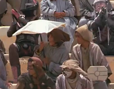 A spectator at a podrace uses an umbrella to shield themself from the sun.